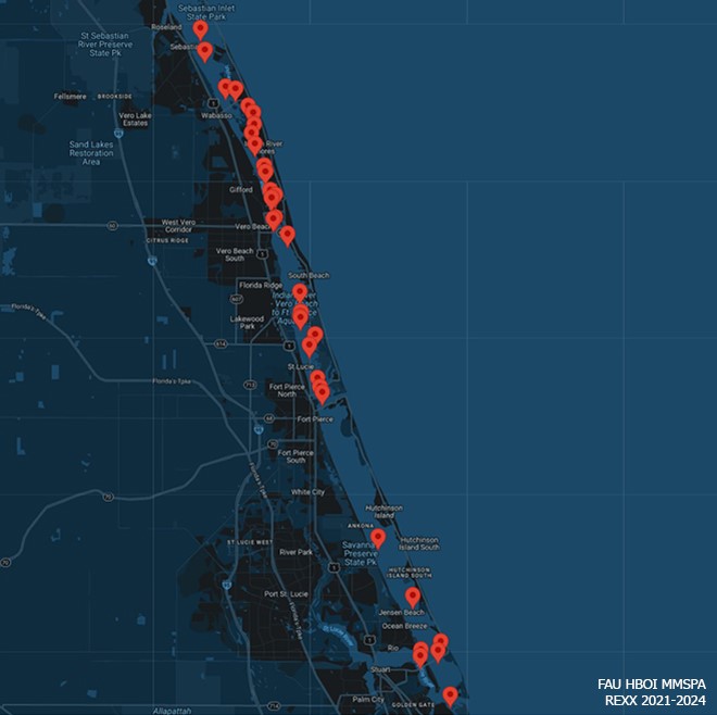 Meet “REXX” who was first identified by the FAU Harbor Branch Marine Mammal Stranding and Population Assessment (MMSPA) team in February 2021 and has been documented 33 times since. The MMSPA team uses the unique markings on a dolphin’s dorsal fin to identify individuals – much like a human fingerprint – and REXX’s distinct upper notches make her easy to recognize in the field.